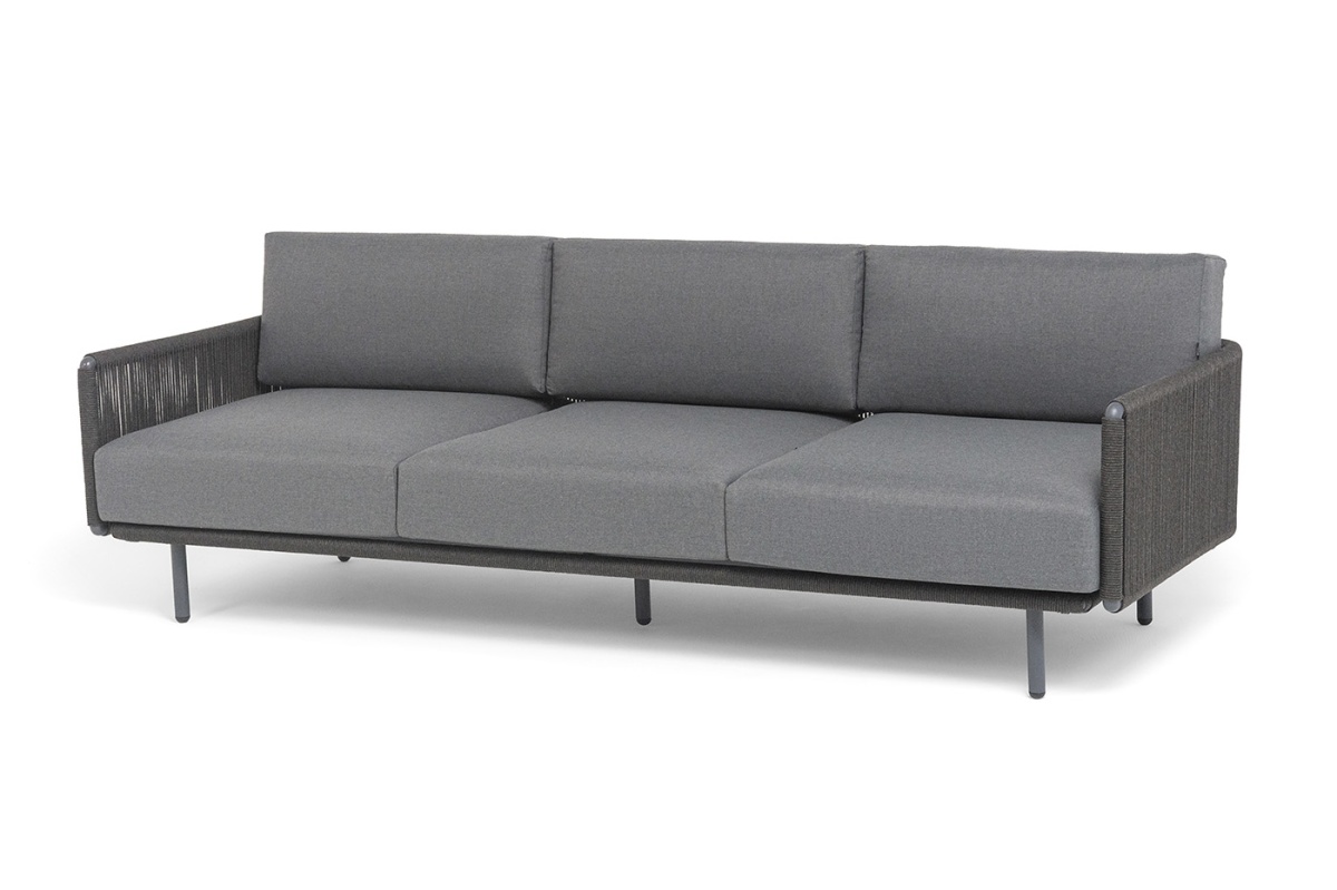 "Джелло" диван 3-местный плетеный из роупа, каркас алюминий темно-серый (RAL7024) муар, роуп темно-серый круглый, ткань темно-серая 027цвет Темно-серый