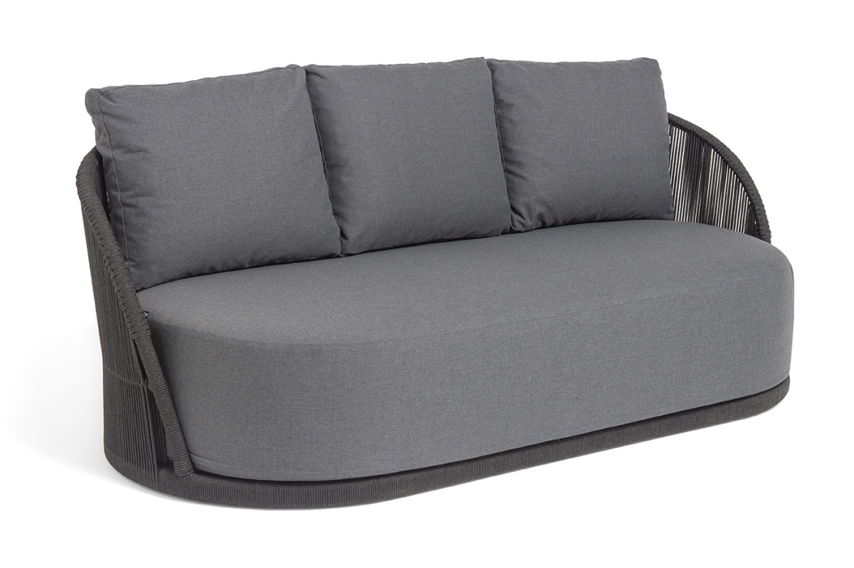 "Монтелла" диван 3-местный плетеный из роупа, каркас алюминий темно-серый (RAL7024) муар, роуп темно-серый круглый, ткань темно-серая 027цвет Темно-серый