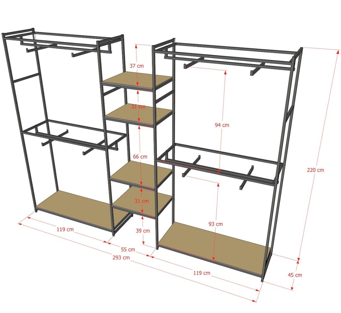 Модель КЧ-2212 высотой 220 см, шириной 293 см, глубиной 45 см. Предназначен как для гардеробных, так и для магазинов, шоурумов, выставок и иных мероприятий.