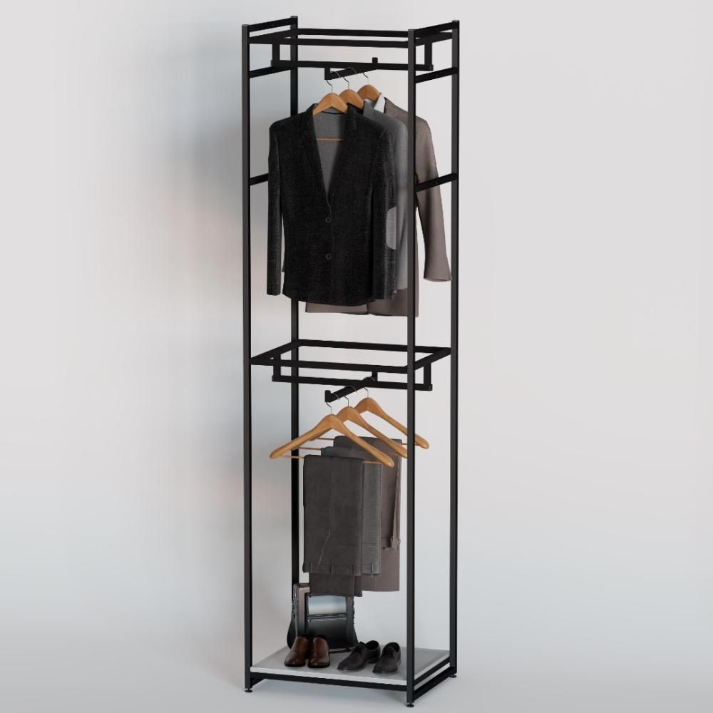 Стеллаж в стиле LOFT для одежды с нижней полкой и двумя штангами с кронштейнами для вывешивания одежды.