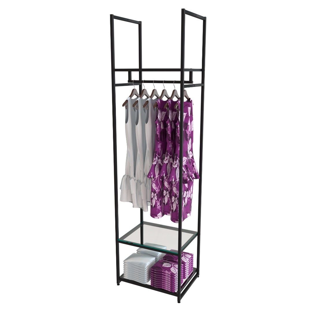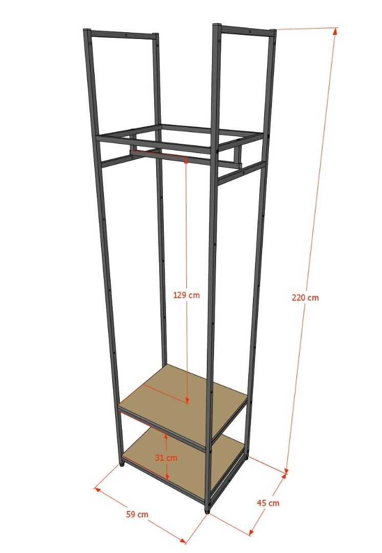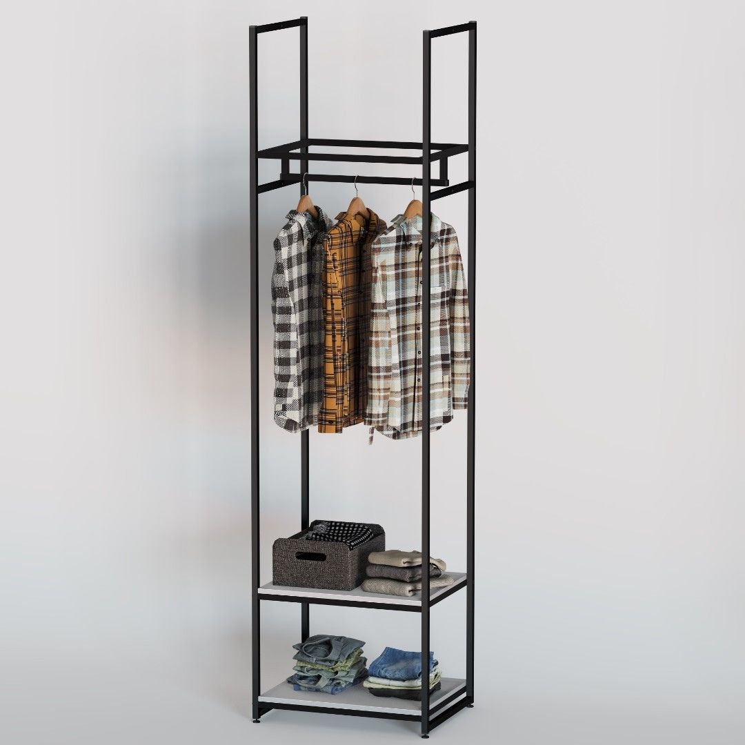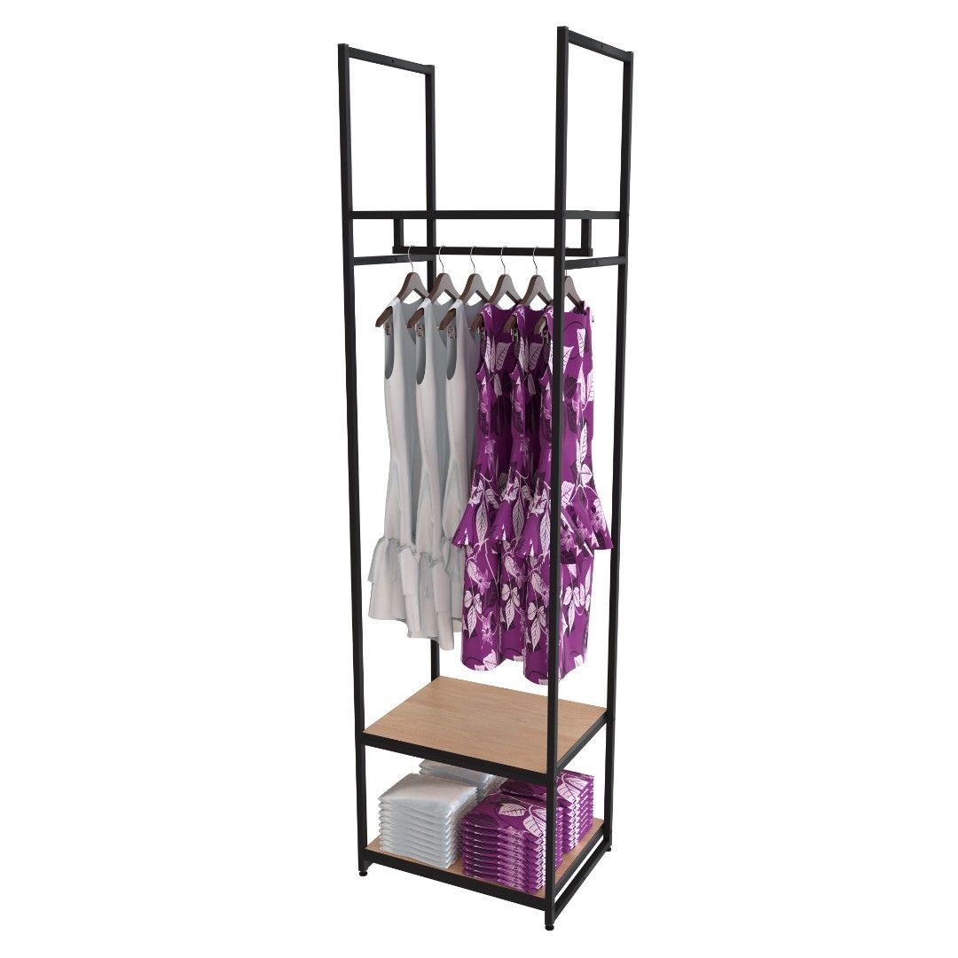 Стеллаж в стиле LOFT для одежды с двумя нижними полками и штангой для вывешивания одежды.