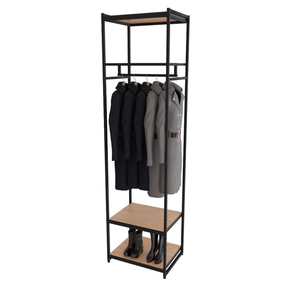 Стеллаж в стиле LOFT для одежды с двумя нижними и одной полкой с верху и штангой с кронштейном для вывешивания одежды.