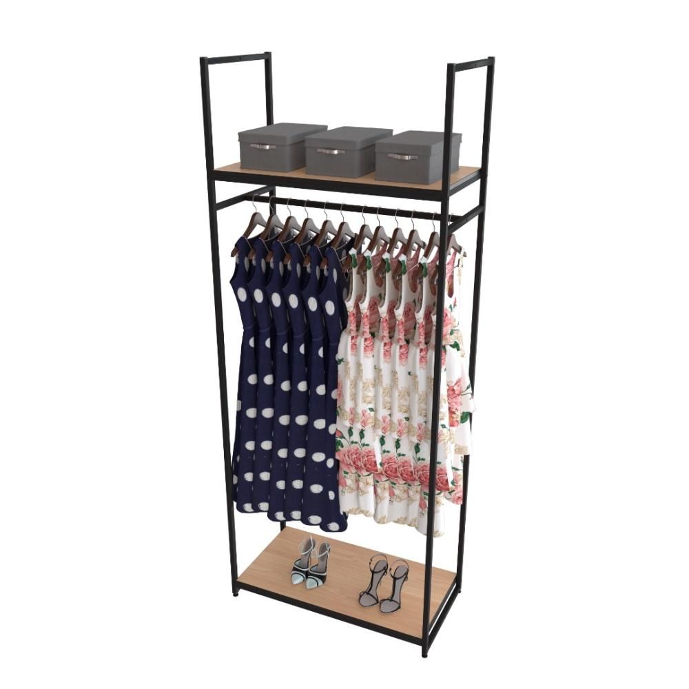 Прочный, стильный и удобный стеллаж с двумя полками вверху и внизу, а также штангой для вывешивания одежды.