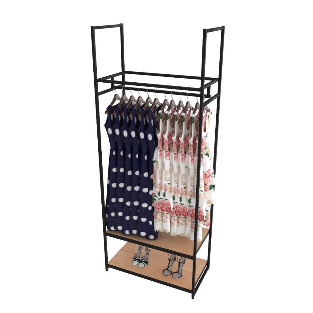 Прочный, стильный и удобный стеллаж с двумя нижними полками и кронштейном для вывешивания одежды.