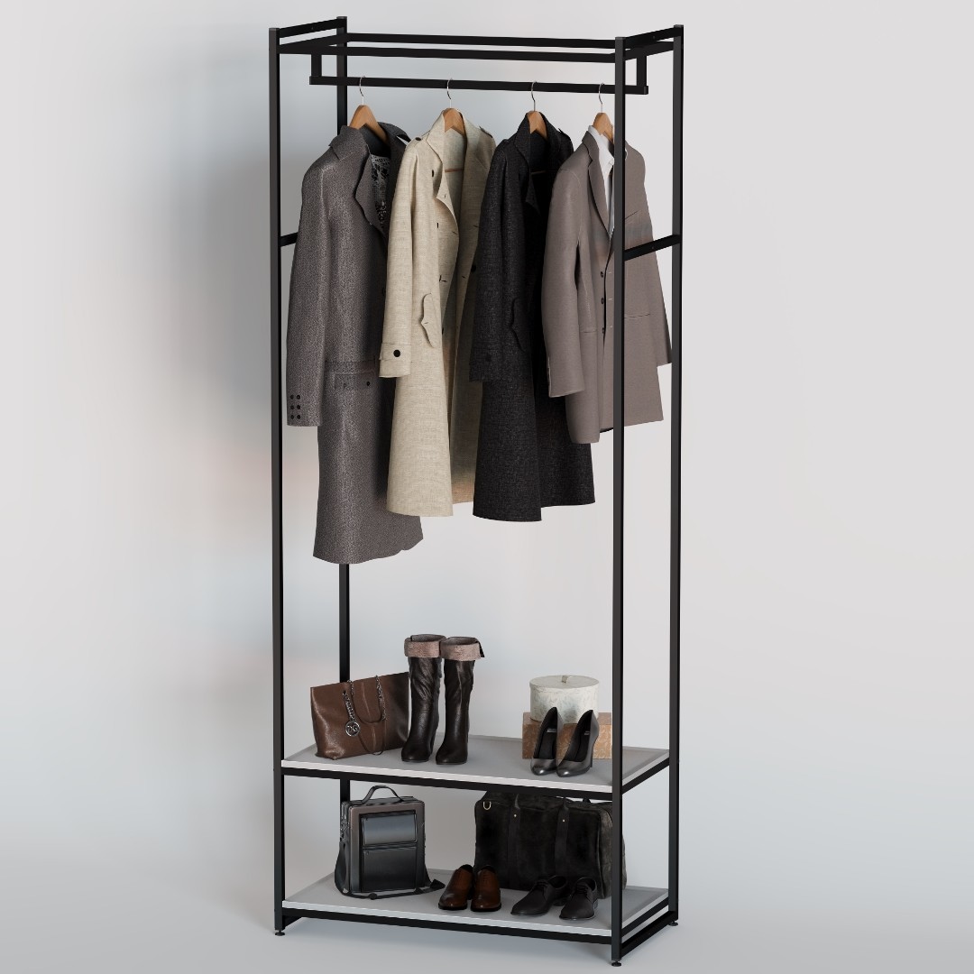 - Функциональность. Две полки и штанга обеспечивают удобное хранение длинной одежды, брюк, курток, обуви и аксессуаров.