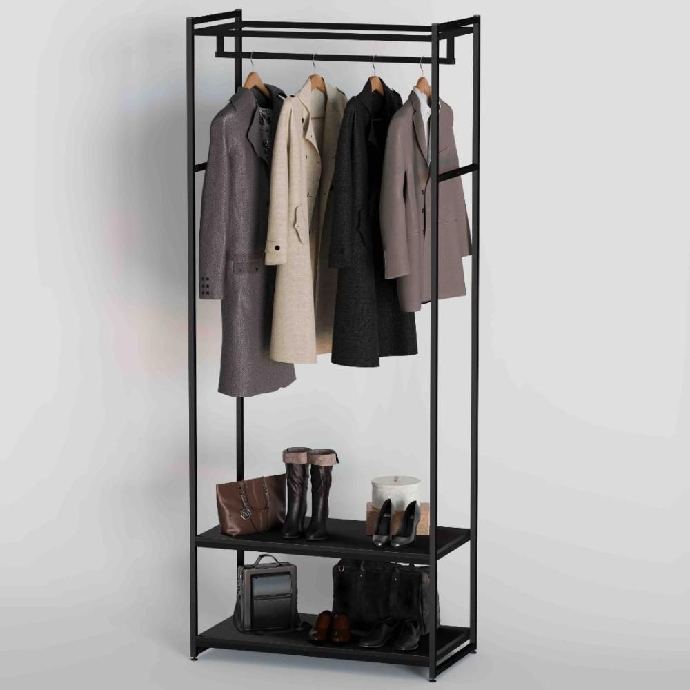 Прочный, стильный и удобный стеллаж с двумя нижними полками и кронштейном для вывешивания одежды.
