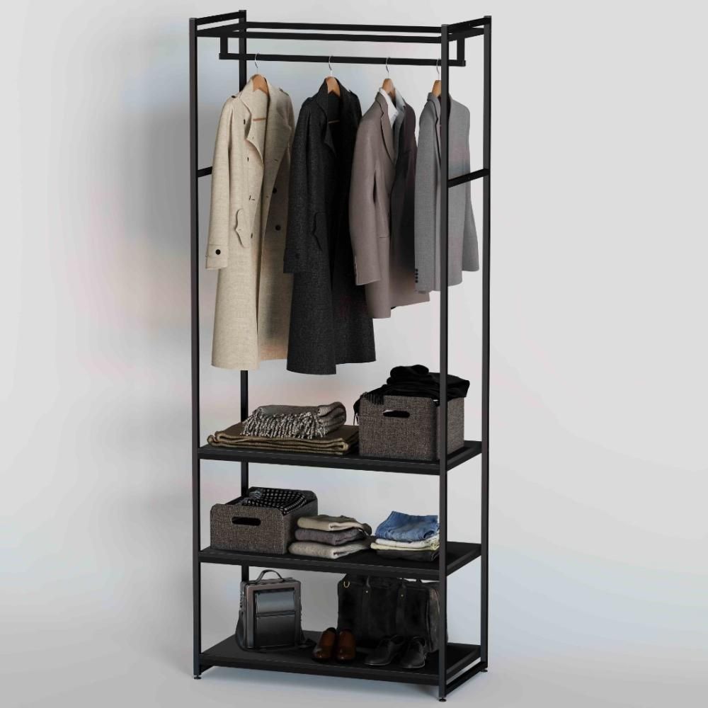 Прочный, стильный и удобный стеллаж с тремя нижними полками и кронштейном для вывешивания одежды.