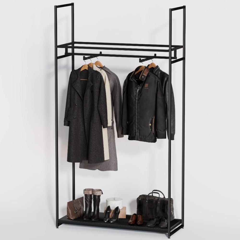 Прочный и удобный стеллаж в стиле LOFT для одежды с одной нижней полкой и кронштейнами для вывешивания одежды.