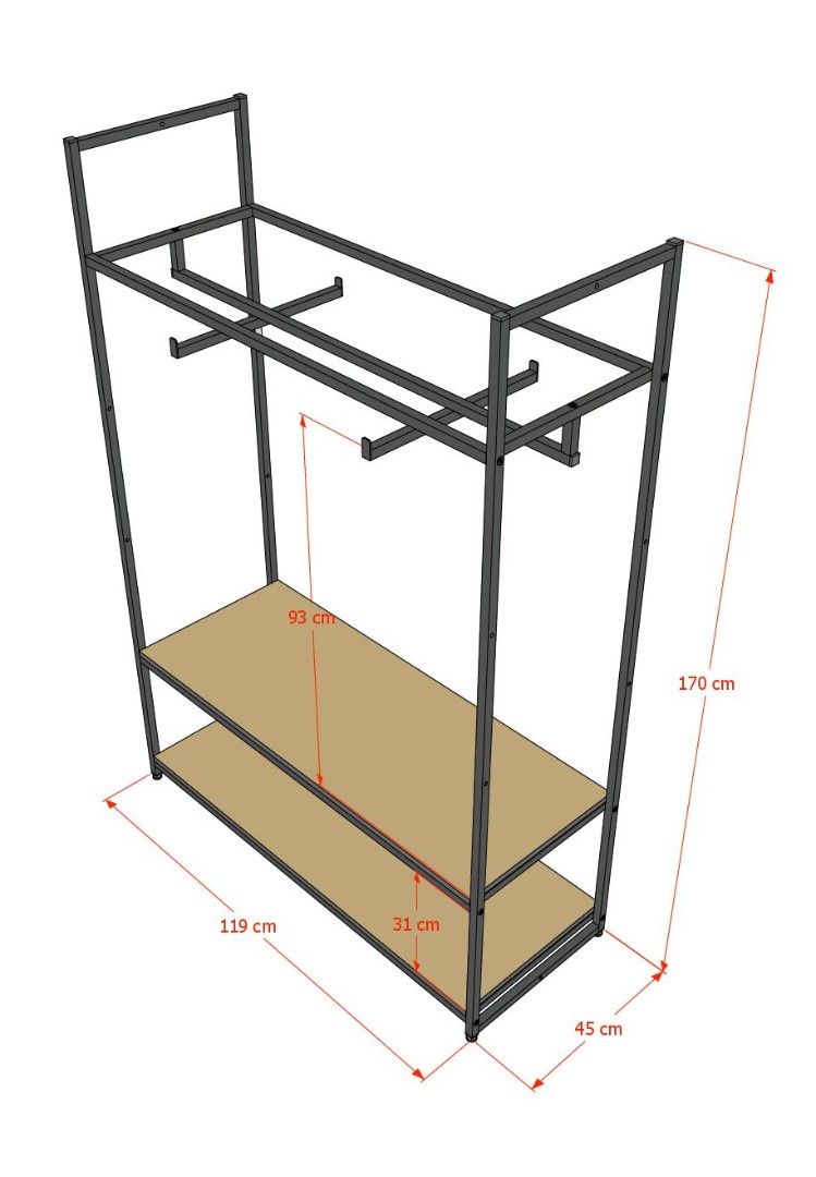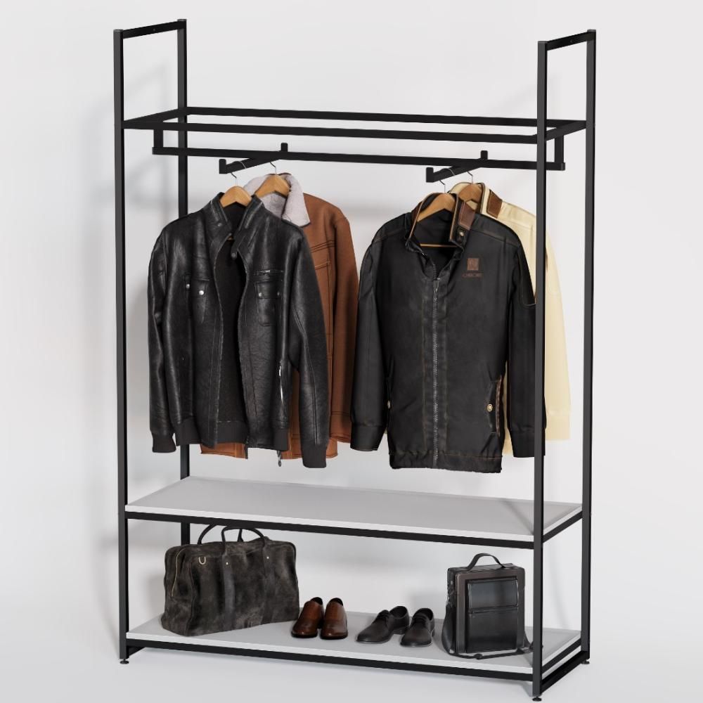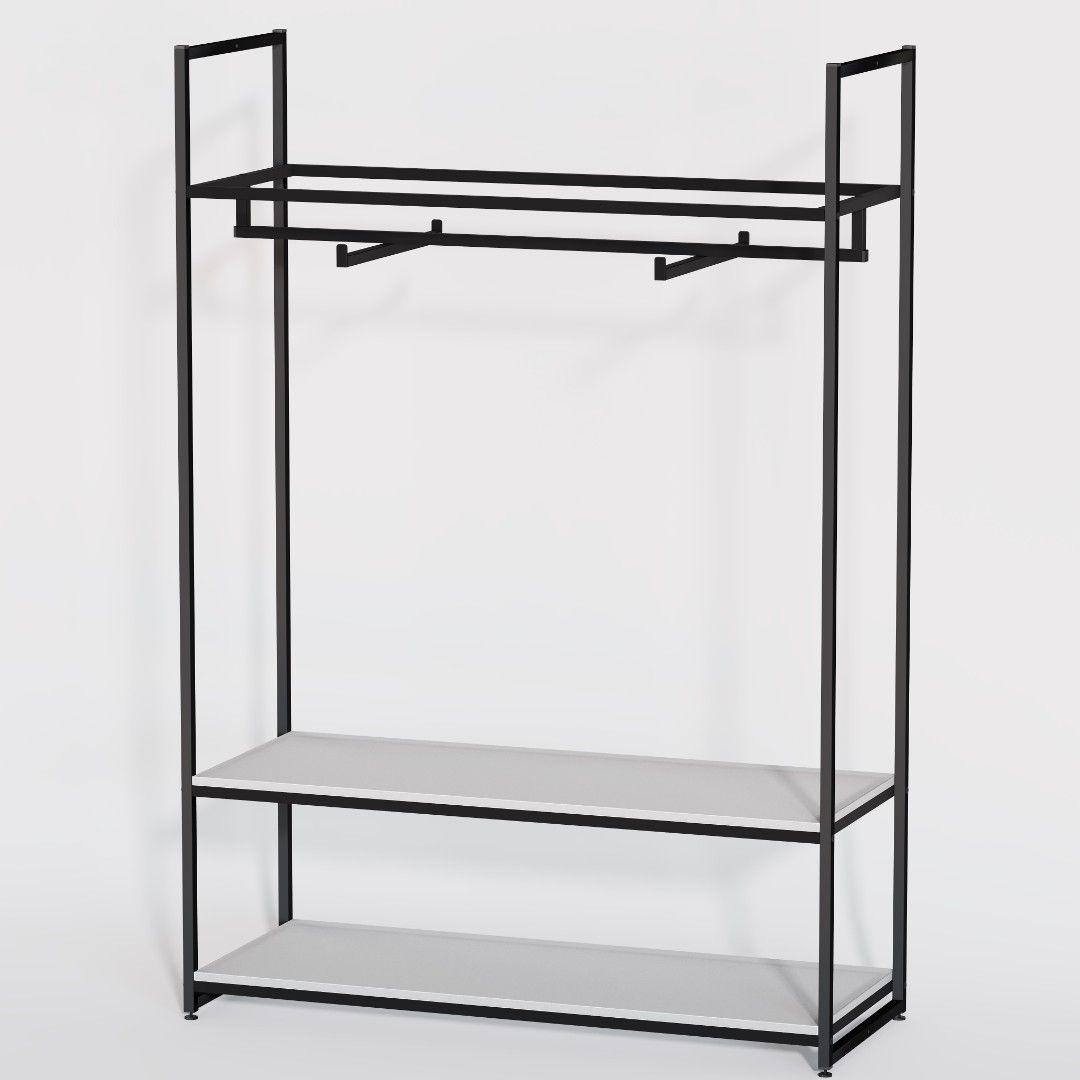 Стеллаж в стиле LOFT для одежды с двумя нижними полками и штангой с кронштейнами для вывешивания одежды.