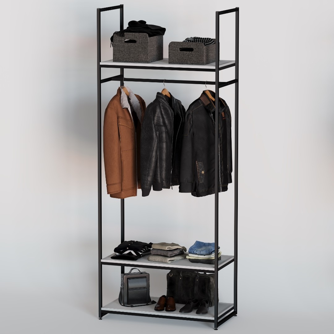 Прочный и стильный стеллаж в стиле Loft, сочетающий удобную полку и кронштейн для вывешивания одежды. Высота модели — 220 см, ширина — 89 см, глубина — 45 см. Подходит как для домашнего гардероба, так и для оформления магазинов, шоурумов, бутиков или выставочных площадок.