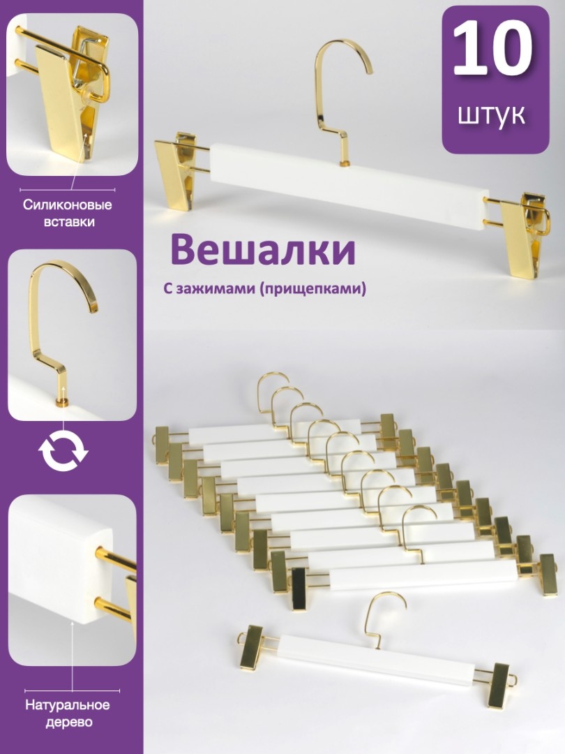 Набор из 10 белых деревянных вешалок с прищепками и крючком золотого цвета