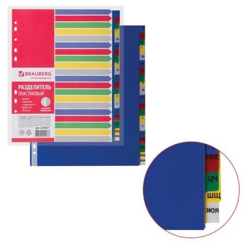 Разделитель пластиковый BRAUBERG, А4+, 20 листов, алфавитный А-Я, оглавление, цветной, РОССИЯ, 225627