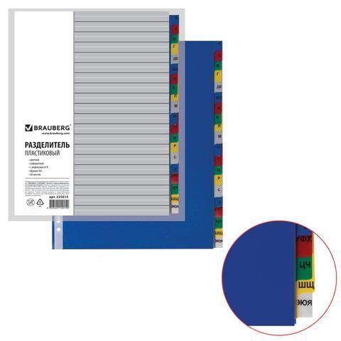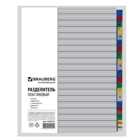 Разделитель пластиковый BRAUBERG, А4, 20 листов, алфавитный А-Я, оглавление, цветной, РОССИЯ, 225615