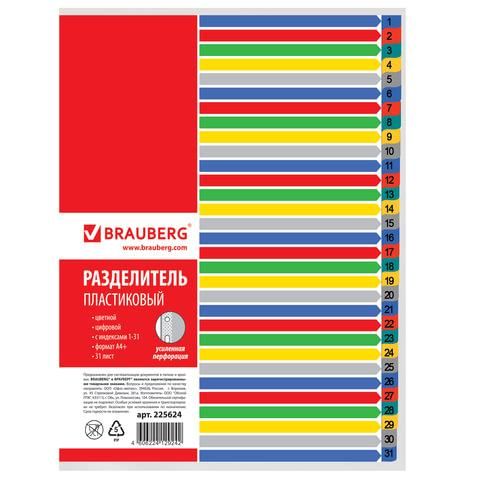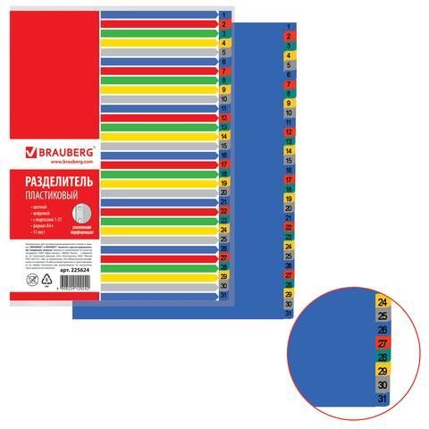 Разделитель пластиковый BRAUBERG, А4+, 31 лист, цифровой 1-31, оглавление, цветной, РОССИЯ, 225624