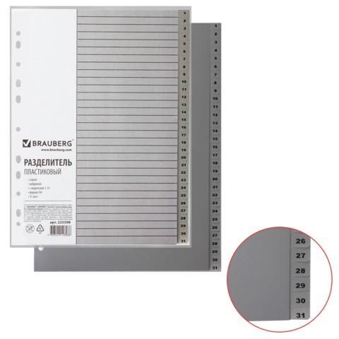 Разделитель пластиковый BRAUBERG, А4, 31 лист, цифровой 1-31, оглавление, серый, РОССИЯ, 225598
