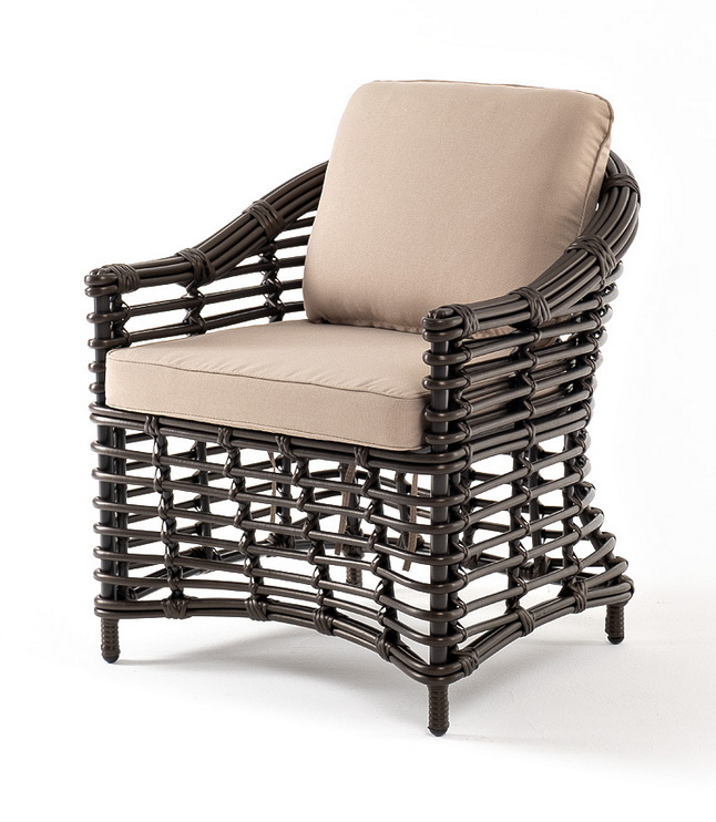 Каркас мебели сделан из прочного алюминия с высокими эксплуатационными качествами. Оплетен вручную с помощью круглого искусственного ротанга. Представлено в бронзовом оттенке.