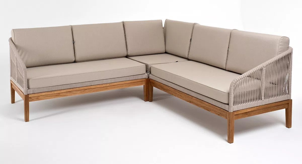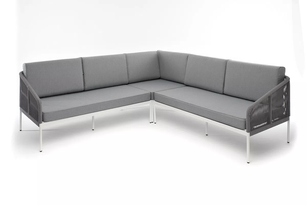 "Канны" диван модульный плетеный из роупа, каркас алюминий белый, роуп светло-серый круглый, ткань светло-сераяцвет светло-серый