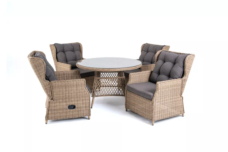 Обеденная группа из искусственного ротанга: 4 раскладывающихся кресла и обеденный стол со стеклянной столешницей.