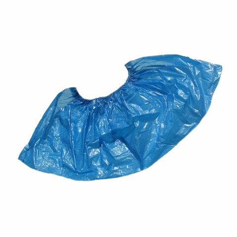 Бахилы одноразовые синего цвета с одинарной резинкой, однослойные.