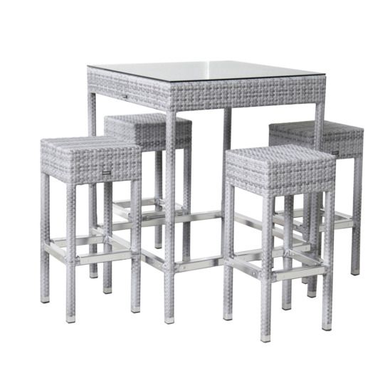Современный элегантный комплект мебели для отдыха состоит из 1 высокого стола и 4 барных стульев с металлическими подножками. Стол со стеклянной столешницей.Изготовлен из прочного искусственного ротанга с алюминиевым каркасом. Атмосферостойкий и устойчивый к ультрафиолетовому излучению. Набор прекрасно впишется в любой интерьер, будь то загородный дом или летнее кафе на открытом воздухе. Современные и практичные материалы позволяют эксплуатировать мебель круглы год не убирая ее на зимнее хранение.