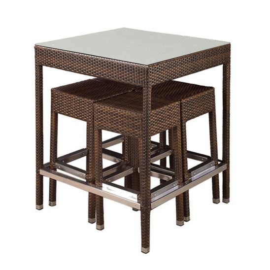 Современный элегантный комплект мебели для отдыха состоит из 1 высокого стола и 4 барных стульев с металлическими подножками. Стол со стеклянной столешницей.Изготовлен из прочного искусственного ротанга с алюминиевым каркасом. Атмосферостойкий и устойчивый к ультрафиолетовому излучению. Набор прекрасно впишется в любой интерьер, будь то загородный дом или летнее кафе на открытом воздухе. Современные и практичные материалы позволяют эксплуатировать мебель круглы год не убирая ее на зимнее хранение.