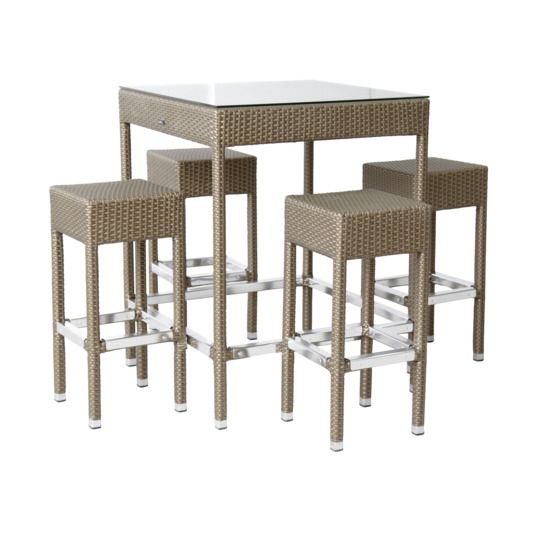 Современный элегантный комплект мебели для отдыха состоит из 1 высокого стола и 4 барных стульев с металлическими подножками.