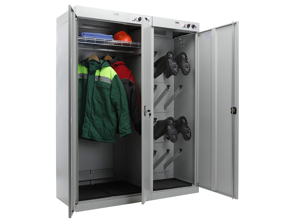 - шкаф состоит из двух независимых секций. Первая двухдверная для одежды, с перекладиной для вешалок и полкой. Вторая - для сушки обуви, оборудована патрубками для развешивания