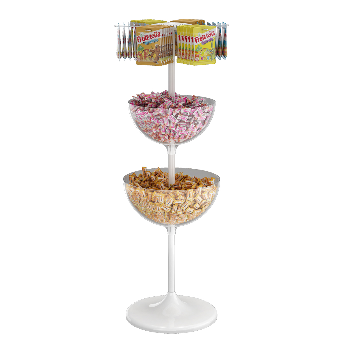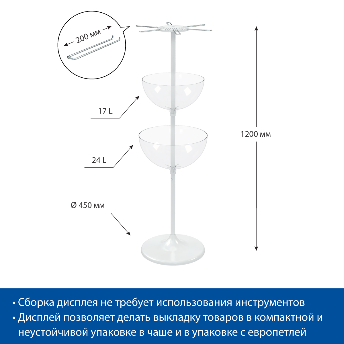 Дисплей UNIBOWL-17-24-HP-6 отлично подходит для выкладки продовольственных и непродовольственных товаров в неустойчивой и компактной упаковке в чашах и в упаковке с широкой петлей (европетля) для подвешивания на шести крючках.