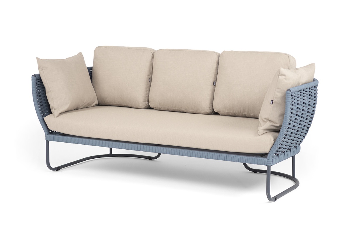 "Фиджи" диван 3-местный плетеный из роупа, каркас алюминий темно-серый (RAL7024) муар, роуп синий (KT18-0014) 15 мм tex, ткань Mossle бежеваяцвет синий (КТ18-0014)