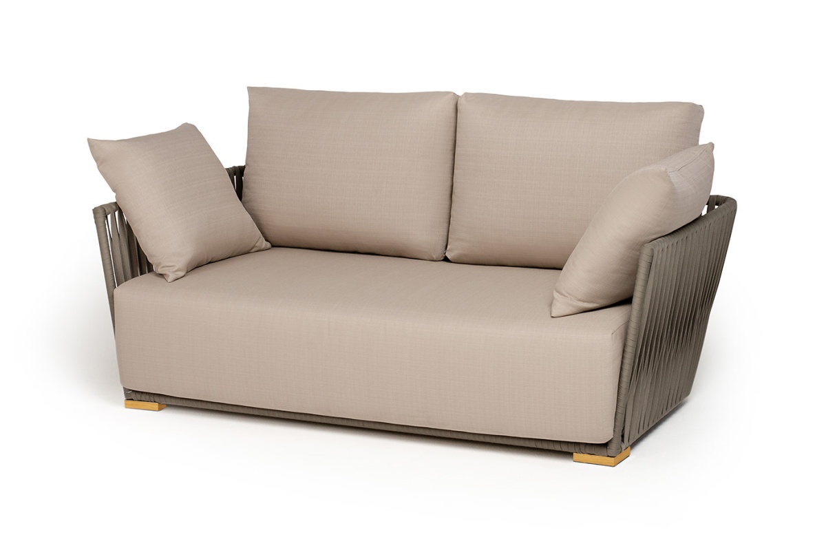 "Форли" диван 2-местный плетеный из роупа, каркас алюминий светло-серый (RAL7035) муар, роуп серо-коричневый 23мм, ткань Mossle бежеваяцвет серо-коричневый
