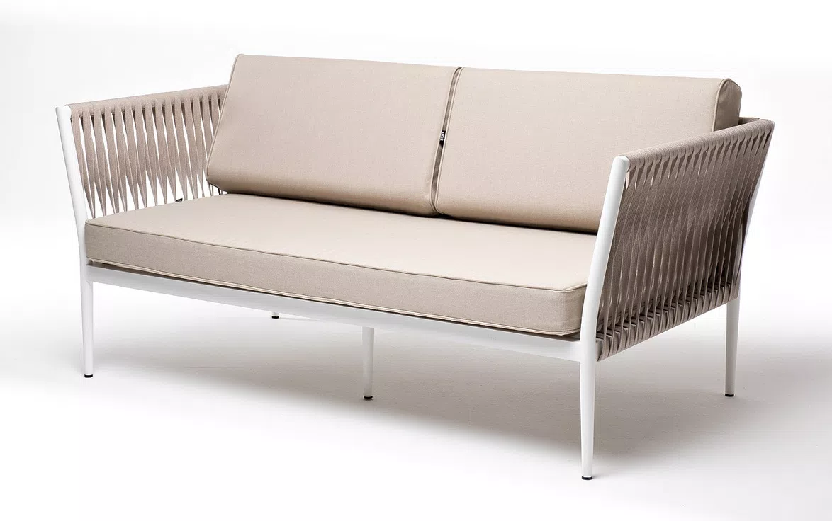 "Касабланка" диван 2-местный плетеный из роупа, каркас алюминий белый муар, роуп бежевый 20мм, ткань бежевая 035цвет серо-коричневый