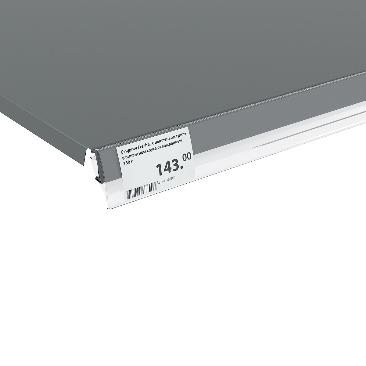 Ценникодержатель для стеллажей 4RM Systems/MODERN-EXPO и КС РУСЬ. Обеспечивает надёжное крепление на краю полки, возможна установка под 2-мя разными углами к поверхности полки (рекомендуется устанавливать ценникодержатели на нижних полках под более острым углом к поверхности полки).