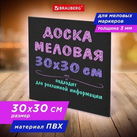 Доска меловая BRAUBERG предназначена для нанесения информации меловыми маркерами. Идеально подходит для яркого размещения информации дома и в различных учреждениях (акции, цены, спецпредложения для клиентов, важные данные).Доска меловая 30x30 см, без рамки. Материал доски – ПВХ черного цвета. Допускается небольшой прогиб доски. Рекомендуется крепить доску к стене/вертикальной поверхности. Крепить доску можно с помощью двустороннего скотча или саморезов. Крепеж не входит в комплект. Для нанесения информации необходимо использовать меловые маркеры. Перед использованием удалите защитную пленку с рабочей поверхности. Рекомендуем использовать слегка влажную тканную салфетку (например, из микрофибры) для качественного и бережного удаления записей и долговременного использования поверхности. Также вы можете приобрести как белые, так и цветные меловые маркеры (поштучно и в наборах) для этой доски в нашем интернет-магазине (например, 151526 и др.).