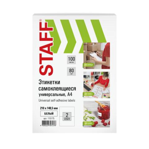 Этикетка самоклеящаяся 210х148,5 мм, 2 этикетки, белая, 80 г/м2, 100 листов, STAFF, 115175