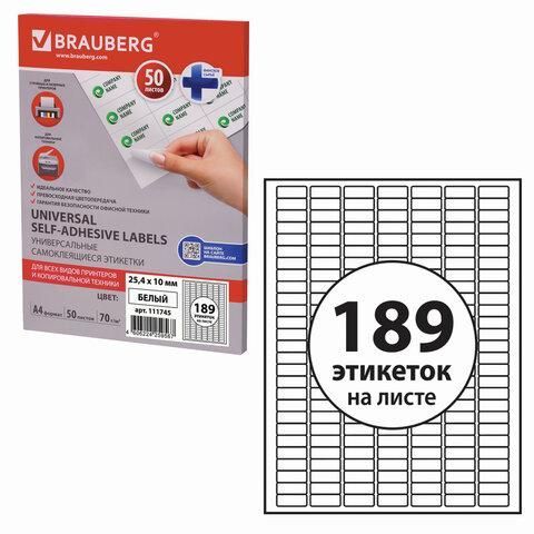 Этикетка самоклеящаяся 25,4х10 мм, 189 этикеток, белая, 70 г/м2, 50 листов, BRAUBERG, сырье Финляндия, 111745