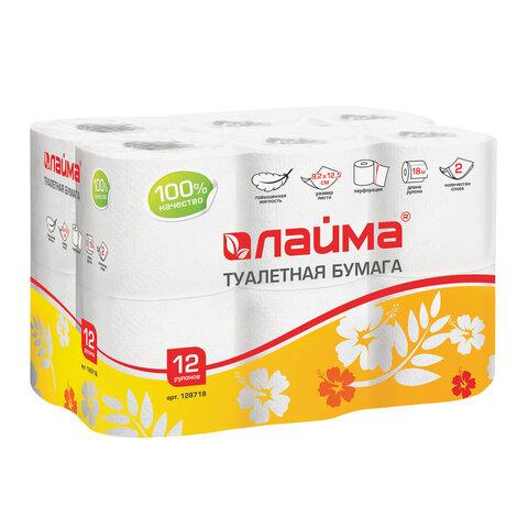 Бумага туалетная бытовая, спайка 12 шт., 2-х слойная, (12х18 м), LAIMA/ЛАЙМА, белая, 128718