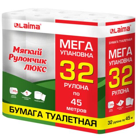 Бумага туалетная "МЯГКИЙ РУЛОНЧИК ЛЮКС" белая, 100% целлюлоза, спайка 32 рулона по 45 метров, 1-слойная, LAIMA, 114736