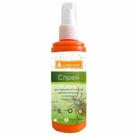 Спрей АЛИРАНТА для защиты от укусов кровососущих и жалящих насекомых.Время действия: при нанесении на кожу – 4 часа; при нанесении на одежду – от насекомых до 30 суток, от клещей до 5 суток (при хранении обработанной одежды в закрытом полиэтиленовом пакете). Состав: N,N – диэтилтолуамид (30,0%), функциональные и технологические компоненты.