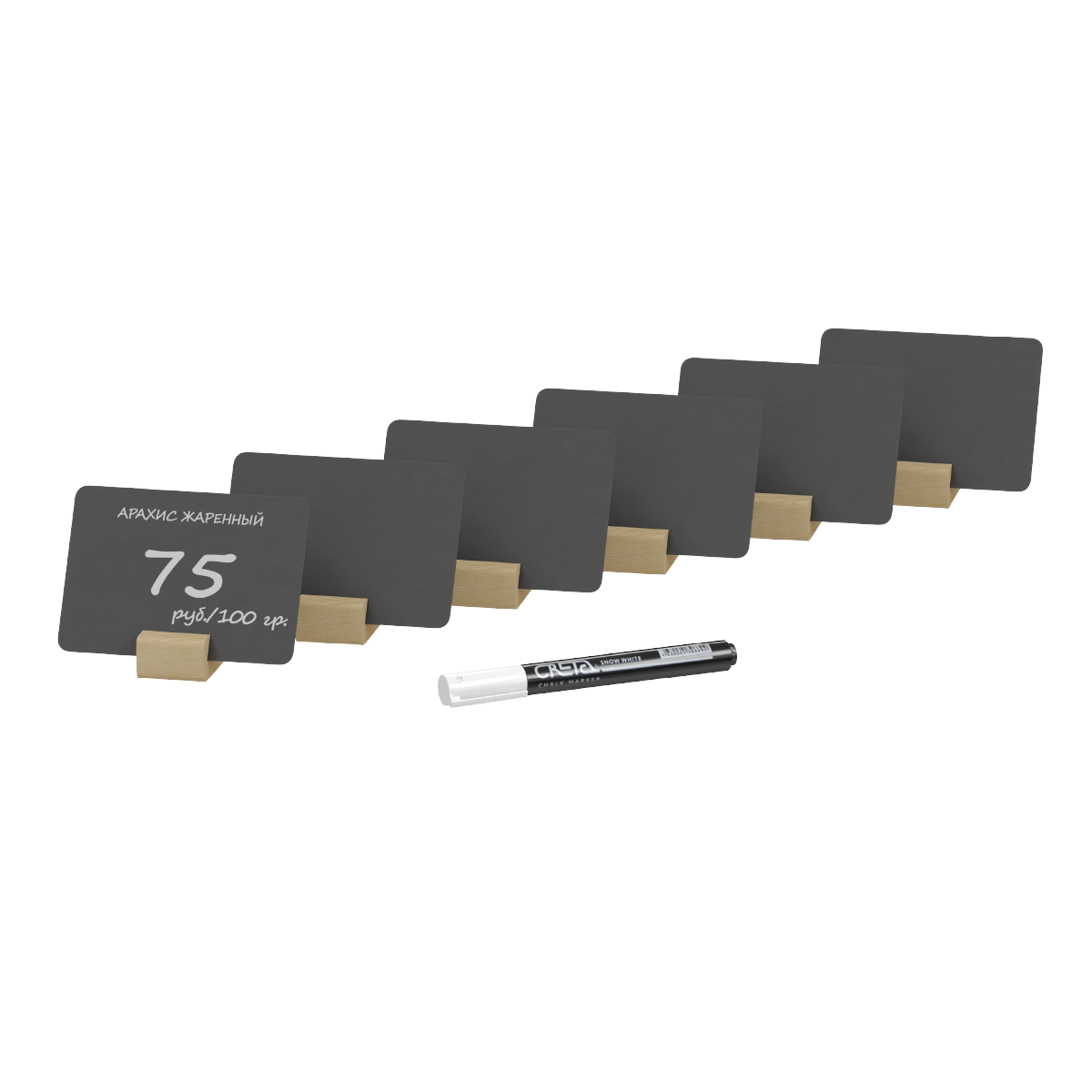 В комплект включены все необходимые предметы для размещения ценника: деревянные держатели ценников, черные таблички формата А7, меловой маркер белого цвета. Такое унивесальное решение подойдет для розничных магазинов или заведений общественного питания любого типа и удачно впишется в интерьер. Деревянное основание – идеальное дополнение для презентации цен на экотовары.