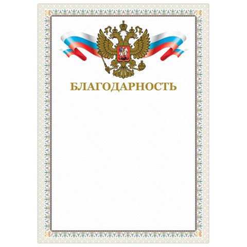 Благодарность с изображением российской символики.Изготовлена из импортного мелованного картона плотностью 230 г/м2. Надписи выполнены с помощью конгревного тиснения фольгой, что подчеркивает статус и торжественность грамоты. Составляется в свободной форме. Имеется изображение российской символики. Формат А4.