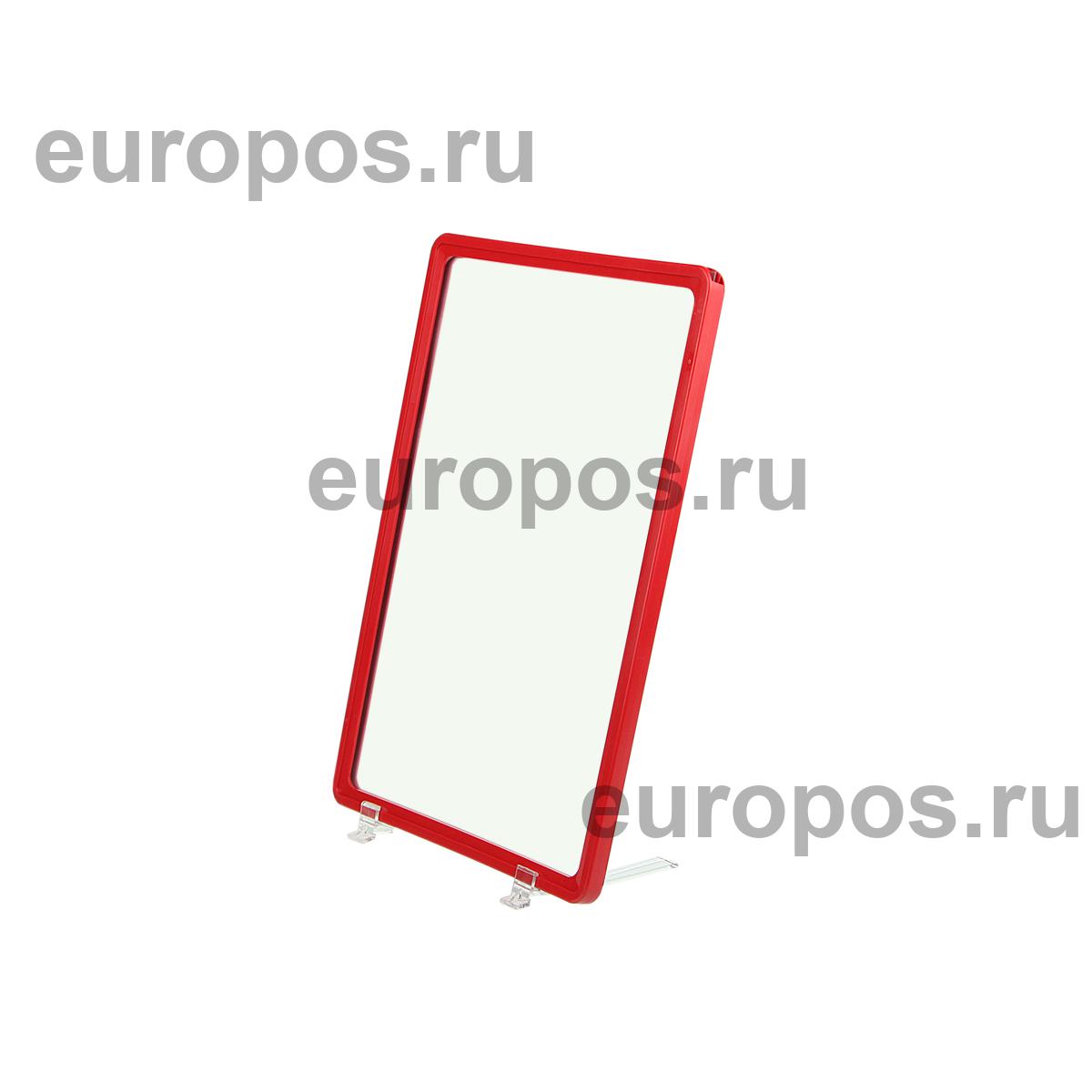 Стойка информационная настольная на подставках BASE-75 с пластиковой рамкой PF-A4 красного цвета и антибликовым карманом-протектором применяется на горизонтальных поверхностях столов, торгового оборудования, крупногабаритных товаров, ресепшн.