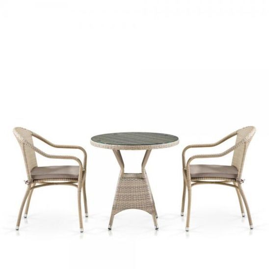 Цвет: Латте. Материал: Искусственный ротанг. Посадочных мест: 2. Форма стола: Круглый. Столешница: Закаленное стекло. Кресло: W58xD48xH84 см. Стол: D75хH74 см.
