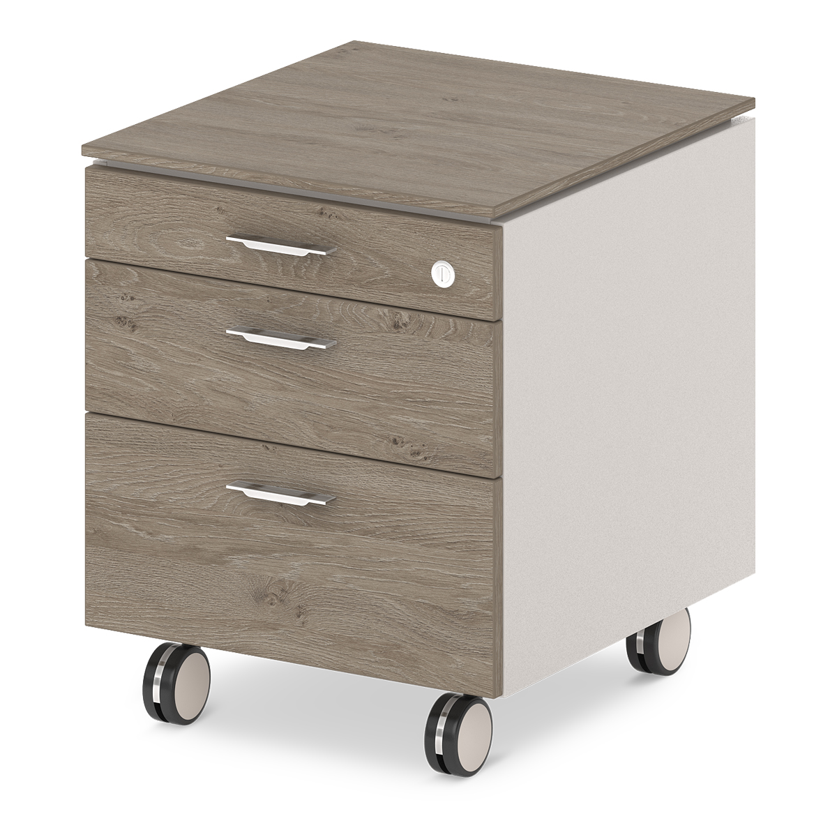 Каркас тумбы и фасады выполнены из ЛДСП 18 мм, облицованы кромкой ABS толщиной 2 мм в цвет плиты. Топ тумб приподнят над каркасом на 9 мм, изготовлен из ЛДСП 12 мм, облицован кромкой 2 мм в цвет плиты. Тумба имеет 3 выдвижных ящика. Нижний ящик оснащен файловой системой хранения. Дно ящиков - из ЛДСП толщиной 12 мм. В фасад первого ящика устанавливается замок со складным ключом. Тумба имеет 4-х колесных опоры диаметром 80 мм, со стопором, покрытие – «Хром блестящий», цвет ободка колеса – черный, цвет боковой поверхности колеса - серый.