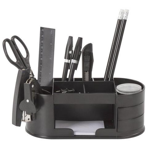 Настольный набор STAFF "Омега" позволяет эффективно и эргономично организовать рабочее место.Подставка изготовлена из пластика и имеет 11 отделений. В наборе 16 предметов: - подставка, - ножницы, - канцелярский нож, - 2 шариковых ручки, - степлер №10, - скобы для степлера №10, - антистеплер, - стирательная резинка, - линейка, - скрепки канцелярские, - 2 чернографитных карандаша, - бумага для заметок, - кнопки канцелярские, - точилка. Это товар эконом-сегмента, поэтому он отличается привлекательной ценой. Товар обладает базовым набором характеристик и простой упаковкой, при этом полностью соответствует основным требованиям потребителей.