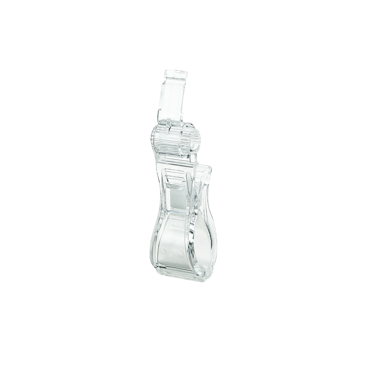 Прозрачная прищепка с держателем для кассет. Возможно крепление на товар, край корзины, вертикальный бортик или трубку с максимальным диаметром 32 мм.
