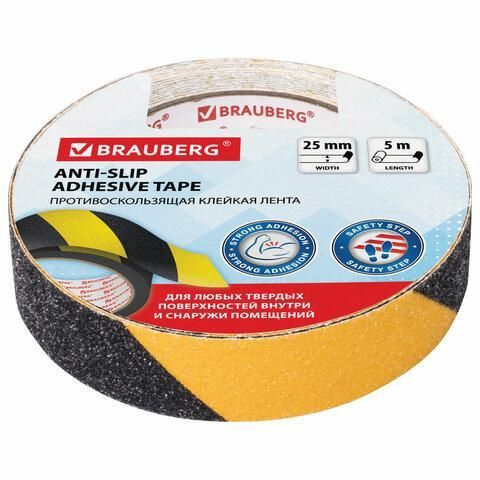 Клейкая ПРОТИВОСКОЛЬЗЯЩАЯ зернистая лента BRAUBERG предназначена для предотвращения ситуаций, связанных с несчастными случаями из-за проскальзывания на любых твердых поверхностях внутри и снаружи помещений.Клейкая лента размером 25 мм х 5 м черно-желтого цвета. Представляет собой ленту на основе ПВХ с покрытием из крошки кремнеуглерода, клеевым слоем на основе сольвента и защитным лайнером для клеевого слоя из силиконизированной с одной стороны бумаги (лента наклеена на лайнер). Крупность зерна 60 grit (количество гранул кремнеуглерода на кв. дюйм). Свойства: 1. Степень противоскольжения R13. 2. Предотвращение ситуаций, связанных с несчастными случаями из-за проскальзывания, для скользких, влажных, масляных и жирных поверхностей; снаружи и внутри помещений; зоны входа, выхода, переходы; лестницы, подъемы, рампы машины, транспортные средства; кухни и столовые; террасы, веранды; для любого типа поверхностей. Монтировать изделие необходимо при температуре выше +12 градусов на очищенную сухую поверхность.