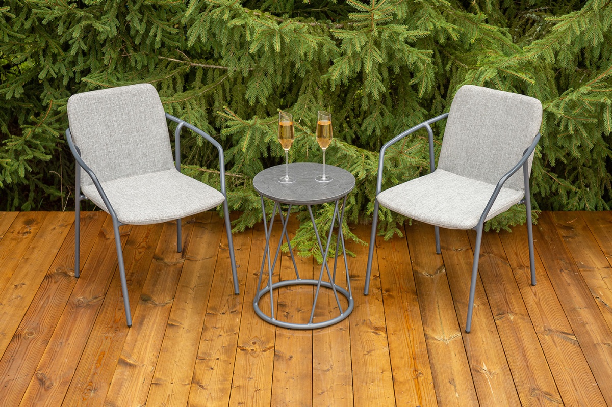 В комплект входят два стула «Марокко» (575×600×800 мм) из текстилена Nanotex с алюминиевым каркасом в темно‑сером цвете (RAL7024) и круглый журнальный столик «Колумбия» (400×400×550 мм) с алюминиевым каркасом и столешницей из монолитного компакт‑пластика HPL (12 мм) в оттенке «серый гранит».
