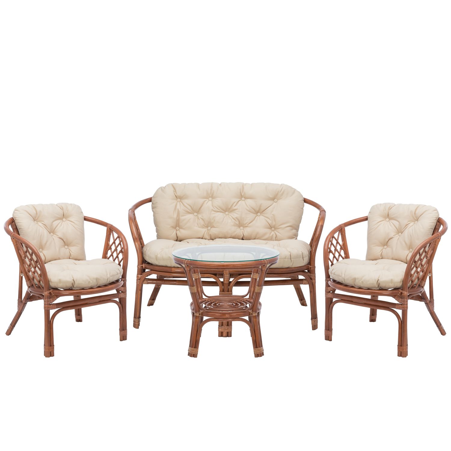 Bahama — комплект мебели для отдыха. Красивый набор плетеной мебели для комфортного отдыха из натурального индонезийского ротанга. Прекрасно впишется в интерьер загородного дома или дачи. Поскольку ротанг не боится кратковременного попадания влаги, то может использоваться на улице, на открытых площадках, верандах, беседках, лоджиях. При производстве используются только натуральные, экологически чистые материалы. В комплект входит 4 элемента: диван, два кресла для отдыха и журнальный столик. Корпус дивана и кресел классической формы из гнутого ротанга, обеспечивающей комфортную посадку, для максимального удобства оснащены подлокотниками, укомплектованы мягкими стегаными подушками, установлены на ножки. Журнальный столик имеет красивое подстолье из ротанга и стеклянную столешницу круглой формы.
