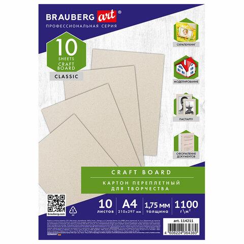 Картон переплетный толщина 1,75 мм А4 (210х297 мм), КОМПЛЕКТ 10 шт., BRAUBERG, 114211