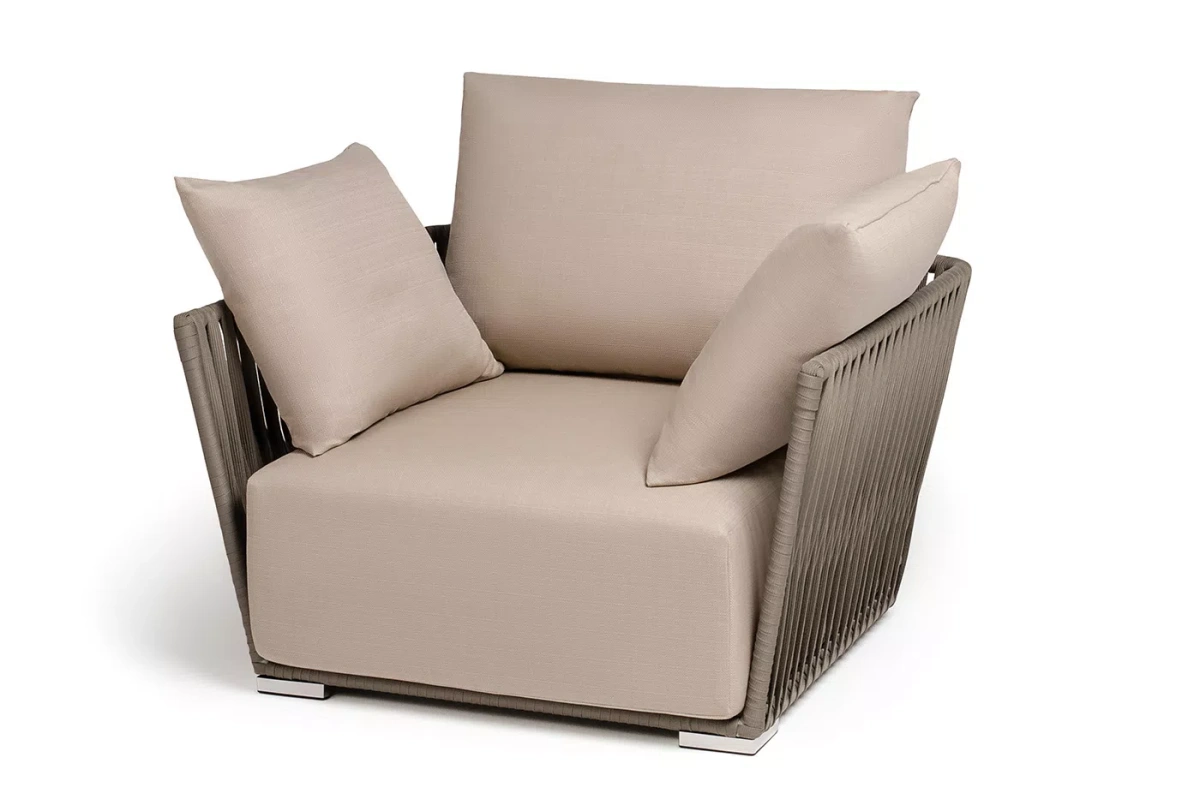 "Форли" кресло плетеное из роупа, каркас алюминий светло-серый (RAL7035) муар, роуп серо-коричневый 23мм, ткань Mossle бежеваяцвет серо-коричневый